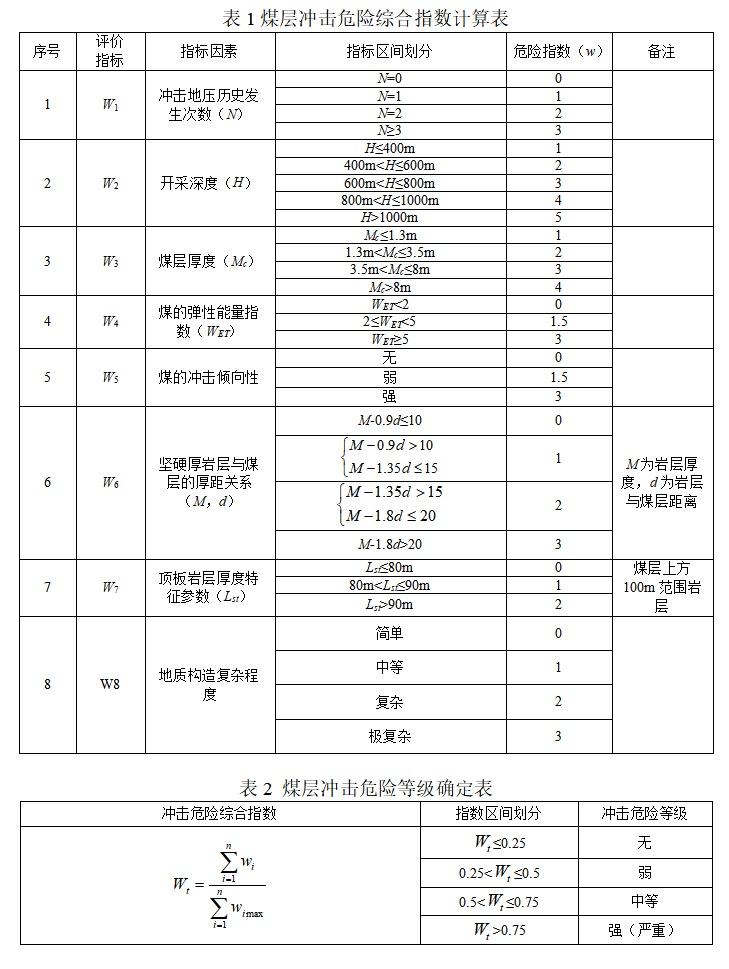 第十二條 煤層沖擊危險性評價采用煤層沖擊危險綜合指數(shù)法,評價結(jié)果分為四級:無、弱、中等和強(嚴重)沖擊地壓危險。