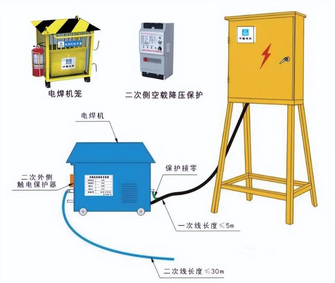 4、電焊機變壓器的一次側電源線長度不應大于5m,其電源進線處必須設置防護罩。