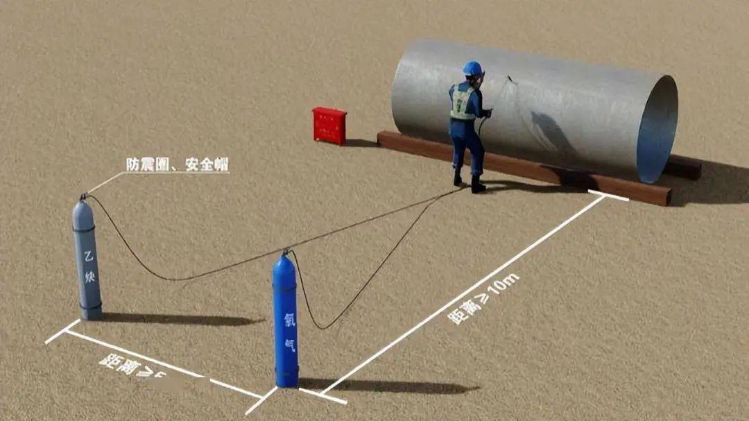 7、作業時,乙炔與氧氣瓶之間的距離不得少于5m,氣瓶與明火之間的距離不得少于10m。